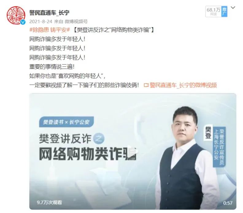 作為長寧的本土企業,“樊登讀書”的相關負責人一聽說民警的來意,立即表示非常歡迎,在北京的樊登老師也欣然接受。于是,宣傳科的民警又忙碌開了,準備相關資料、與編輯對接、共同整理文案……很快,一段時長16分鐘的“樊登講反詐”視頻在2021年8月成功上線,視頻中,樊登老師將電信網絡詐騙的案例、騙術、受騙心理、防范方式娓娓道來,“常見的騙局有很多種,為什么會被騙呢?這是因為每個人內心的7種情緒最容易引發被騙”“96110,這個電話一定要接聽?!辈簧贂崖犃诉@期視頻之后,表示沒想到電信網絡詐騙原來離自己這么近?!白尭嗟娜肆私庠p騙從而避免被騙,正是宣傳科民警期望的目標?!毙⊥辣硎?。