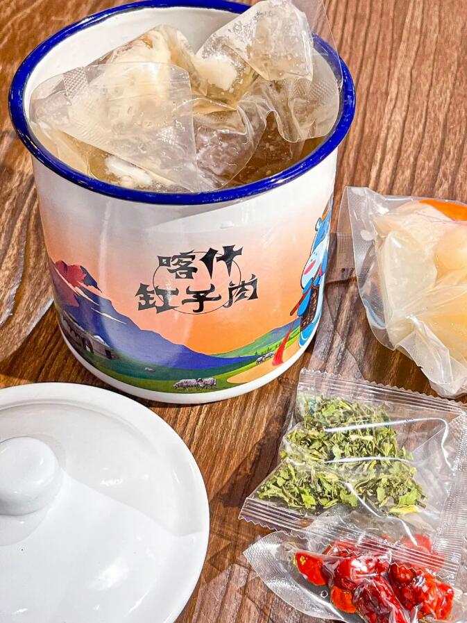 每個搪瓷缸中不低于170g帶骨羊腱肉,加入紅棗、和枸杞,兩三塊胡蘿卜,把缸子蓋往上一蓋,將其燉熟食用。在新疆當地,這是坐在餐館才可享用的小吃,要賣出新疆、還要線上配送,同樣很有挑戰。