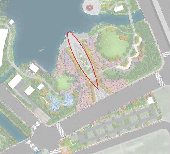 公園入口區域以羅店龍船形態為設計原型,寓意劈波斬浪、一往無前的繁榮之景。設計通過對水鄉街市文化形態的吸取,用簡潔的現代構成手法,形成了一個輕盈通透的城市門頭,使得大門如同取景框一樣,將公園中軸美景映入眼簾,讓游客未入園內即可欣賞一幅天然風景畫。