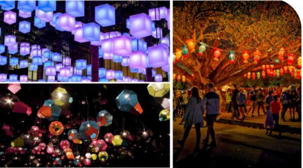 節日期間在公園內掛滿彩燈,營造熱鬧的節日氛圍,呼應羅店彩燈文化。