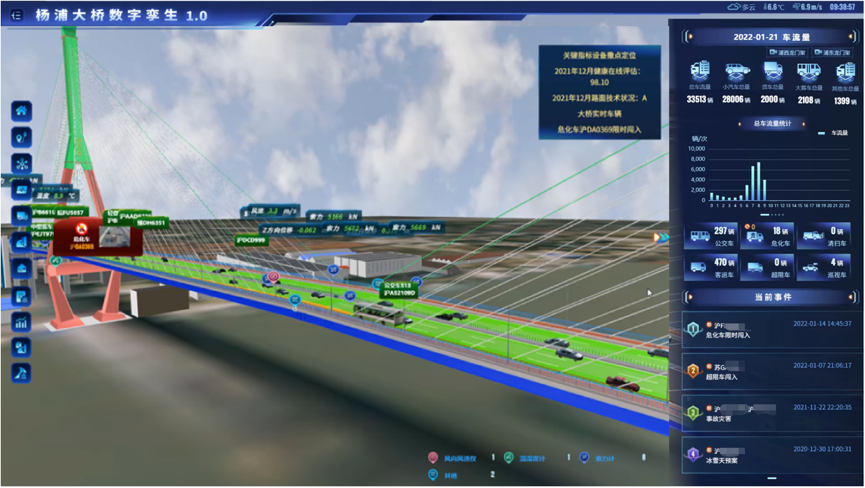 楊浦大橋日車流量約12萬輛次,是上海市道路運輸監管的重點路段和設施。今年,楊浦大橋有了一個“孿生兄弟”——一座被數字孿生技術“克隆”的全數字大橋,以保障橋梁運行安全,實現“觀、管、防”的立體融合管控。