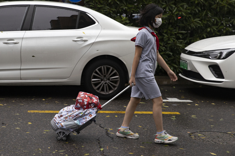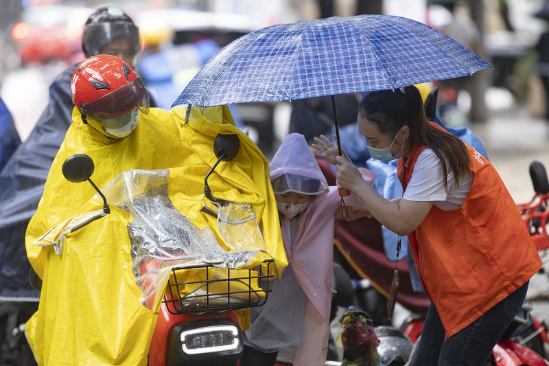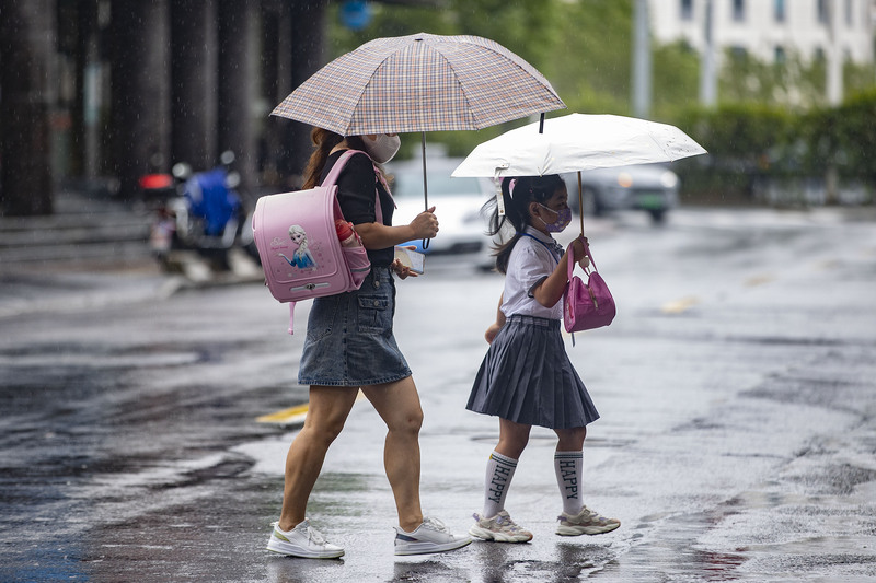 漕河涇實驗小學門口,媽媽陪孩子撐傘過馬路。
