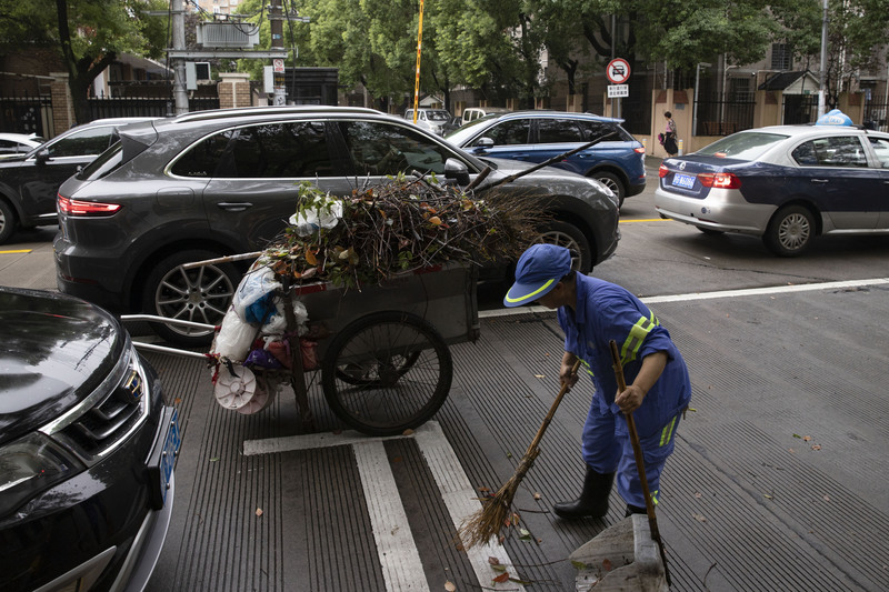 閔行區古龍路上清潔工人在掃落葉。