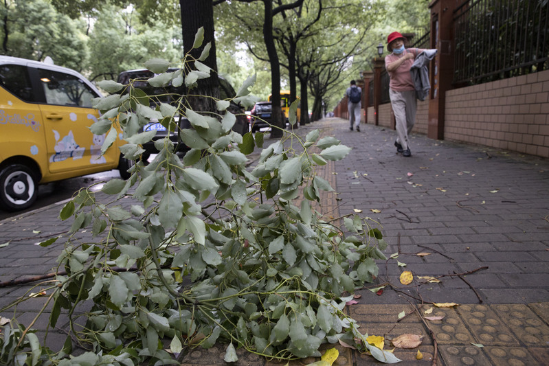 閔行區古龍路上,還能見到昨晚被臺風刮斷的樹枝。