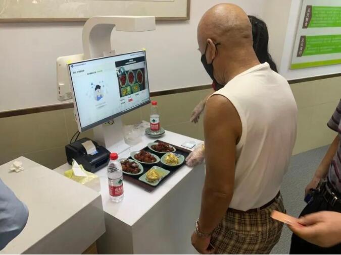 原來,妙膳坊食堂的收銀結算采用AI識別系統。老人只需把盛好食物的餐盤放在掃描設備下,系統便可直接報出應付金額,然后通過面部識別或將飯卡放在指定位置,即可實現一秒結算。