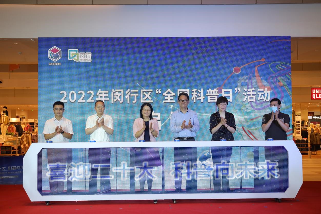 上海市科委副主任、外專局副局長黃紅,上海市科協黨組成員、二級巡視員劉偉,閔行區委副書記唐勁松,閔行區政協副主席余梅,科學明航會創始人涂皘,莘莊維璟印象城總經理趙亮共同啟動2022年閔行區“全國科普日”活動。