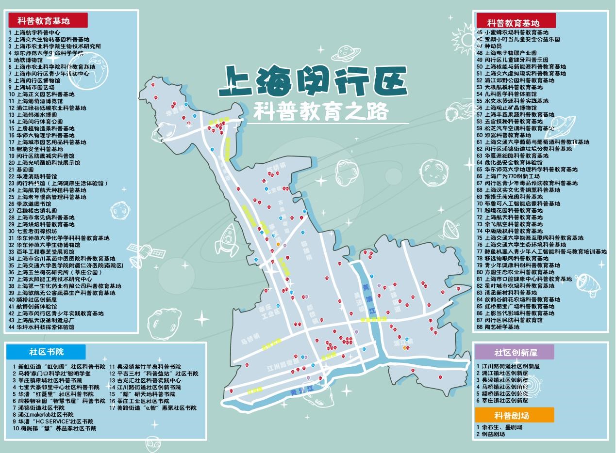目前,閔行區共有區級科普教育基地88家,其中,全國科普教育基地6家,上海市科普基地28家。同時,還建有17家社區科普書院、6家社區創新屋和2家科普劇場。
