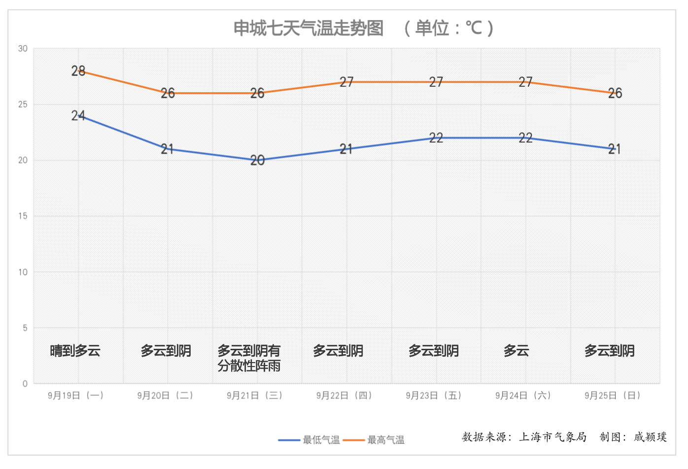 沒有高溫,沒有臺風,上海本周的天氣終于進入平靜期。上海中心氣象臺預報顯示,本周申城天氣情況總體較好,主要以云系變換為主,多云到陰是主基調,沒有明顯雨水,最高溫在26到27℃。