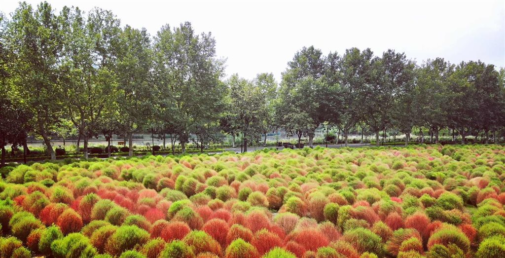 連日的降溫,讓兩萬平方米的地膚換上了紅色新衣,個別植株呈紅變紫,夾在的多數嫩綠植株之中,與綠地藍天相互映襯,畫面色彩絢爛。伴隨著秋天的腳步,天氣也開始慢慢地變涼,地膚的色彩也變得越來越美了,游客將觀賞到“地膚”從綠變紅,最后一片紅褐色的壯觀景象。