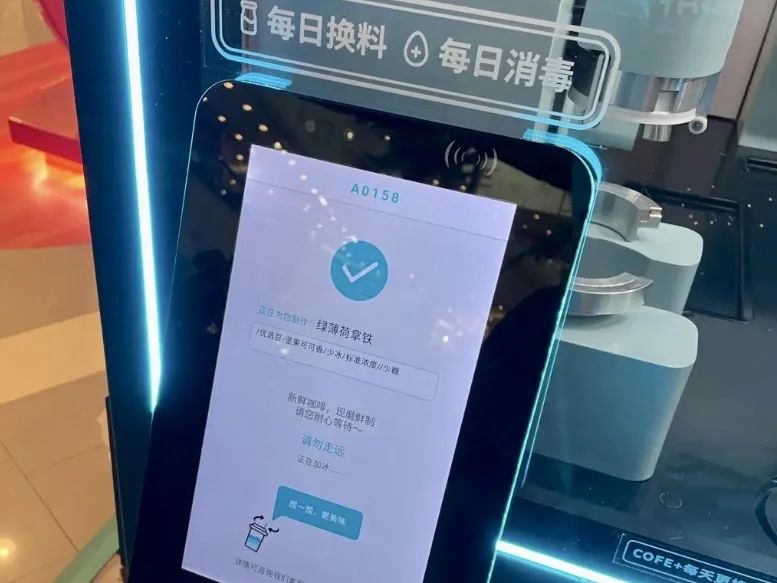 輕輕點擊屏幕,選擇想要購買的品類,再根據個人口味選擇咖啡豆、糖量、濃度……手機付款下單后40秒左右,一杯綠薄荷拿鐵就被機器人做好了。這是COFE+機器人咖啡亭最近推出的新品之一,薄荷的香氣平衡了牛奶的膩和咖啡的苦,讓這款拿鐵的味道喝起來更加豐富。