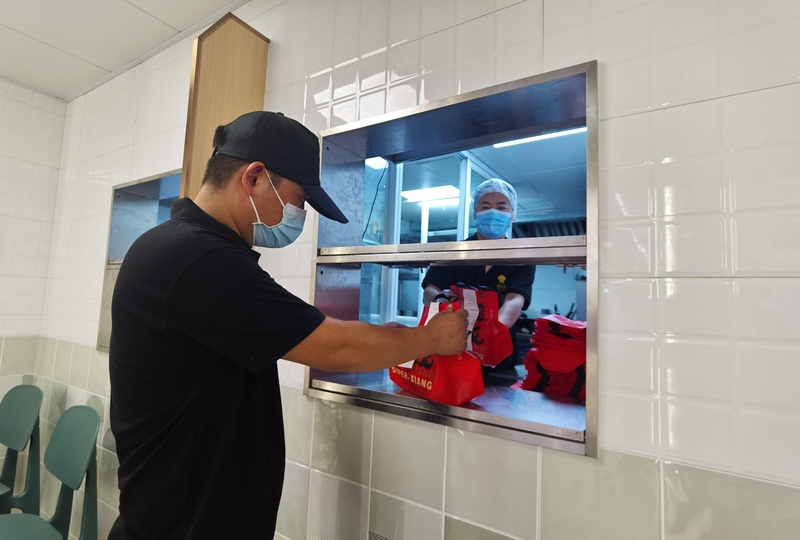 上午九點,上海昊客餐飲管理有限公司的盒飯打包車間內一派忙碌景象,車間的質檢員正將一張張貼紙粘在整裝待發的盒飯箱上,并寫上客戶名稱、生產時間等信息。