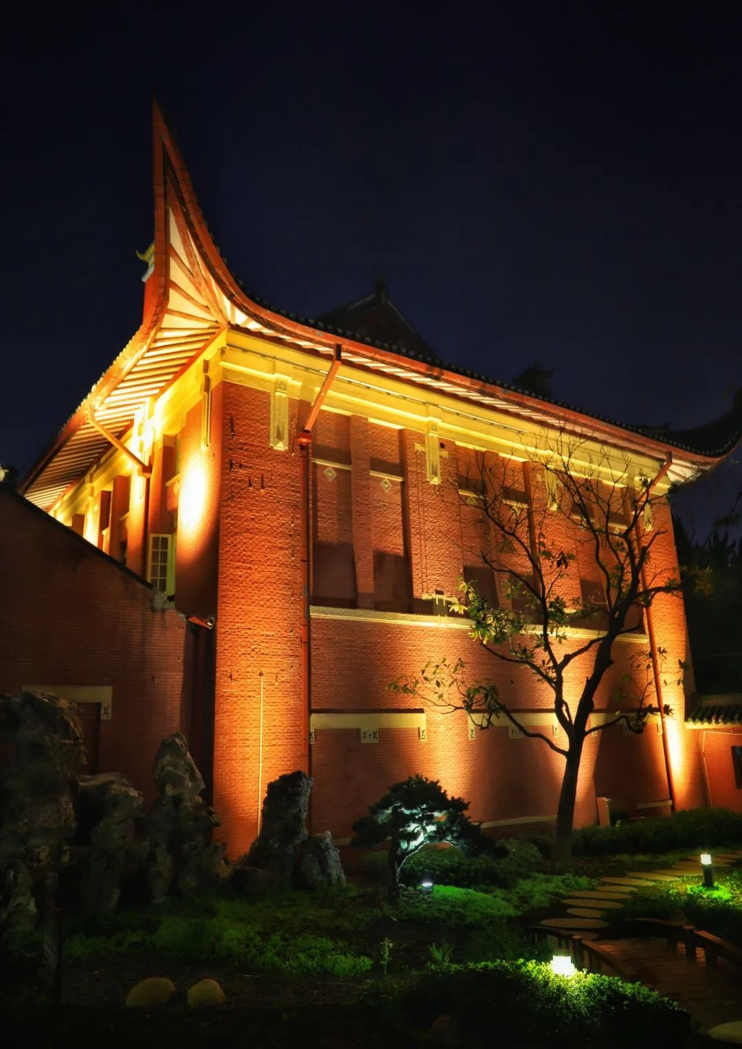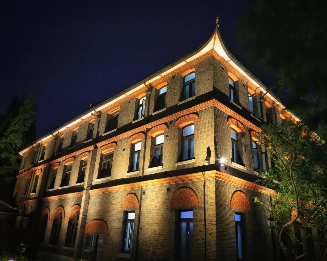 體育樓是中國第一個現代化大學體育館,也是一座百年建筑,其飛檐造型流暢優美,特別具有中國傳統建筑之韻味。因此照明設計以“飛檐流光”為主題,采用遠光投射的方式將飛檐翹角打亮,并與中式小花園形成互相呼應成趣的夜景。