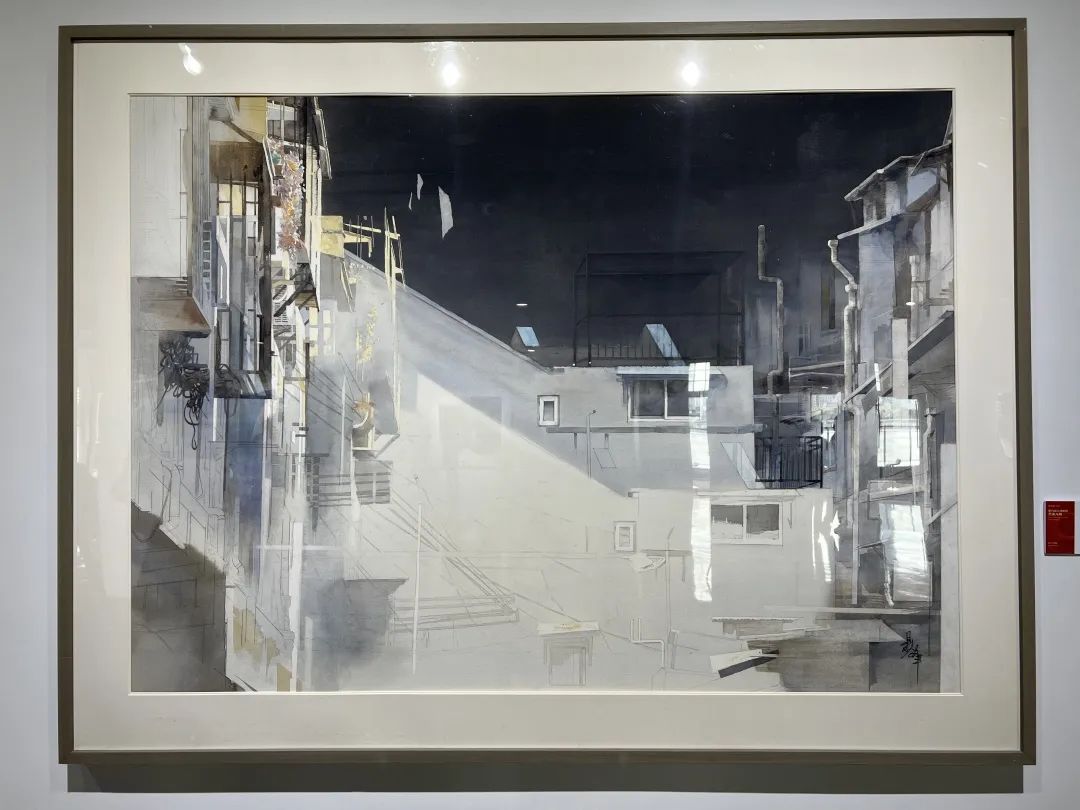 相信很多上海人的童年,是在閣樓上度過的??吹竭@幅《再見·帶閣樓的房子》,仿佛夢回上世紀五六十年代。這是一個深夜,一側是灰暗老樓,設施陳舊,空間逼仄;一側是窗臺燈火,溫暖明亮,象征著城市的新陳代謝。很快,這兒的居民將隨著舊區改造,迎來新生活。