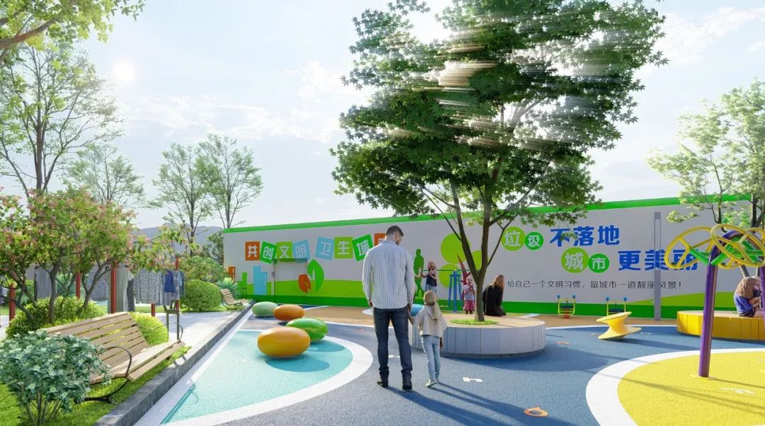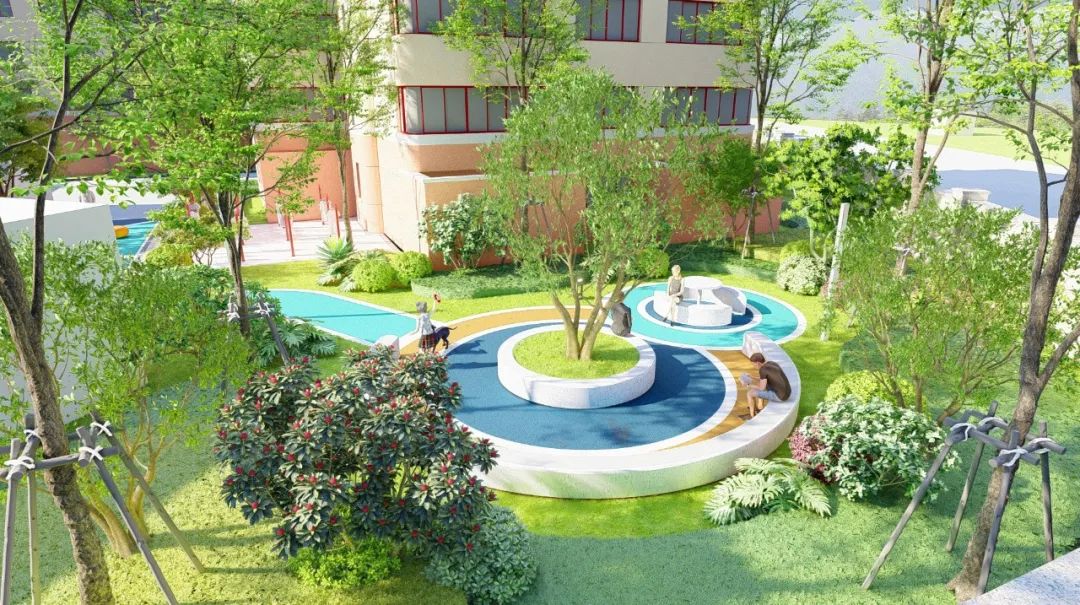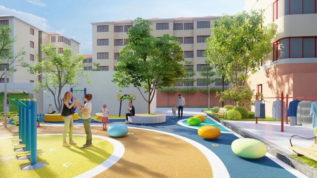 增加兒童活動設施與部分健身器材,提高場地的氛圍感和互動性。在該區域,陽光最好的一塊將作為小區的集中晾曬區,緊挨著兒童游樂區。