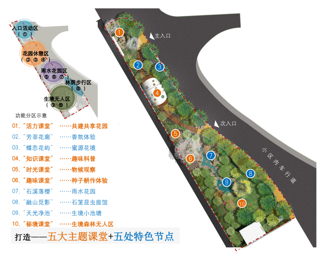 “融·生境花園”總面積約為950平方米,其中純生境面積達到645平方米。南北向總長76米,東西最窄處只有7米寬,最寬處為18.5米,這樣一個不規則形狀的“開放式”生境花園,將通過打造5處特色節點和5大“主題課堂”,給居民集科學、文學、美學于一體的體驗。