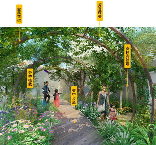 沿著架空的生境花園步道,利用生態竹材搭建的環形花架,仿佛一個“穿越通道”,帶你進入到“秘密森林”。