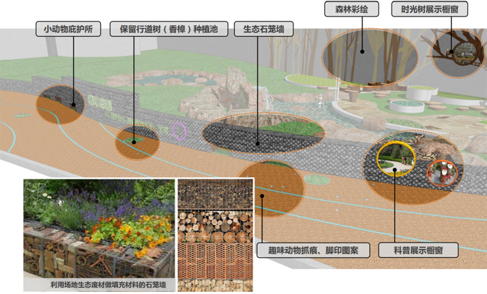石籠墻對應的步道上,還將印有動物的抓痕、腳印圖案,讓整個區域富有立體感和層次感。