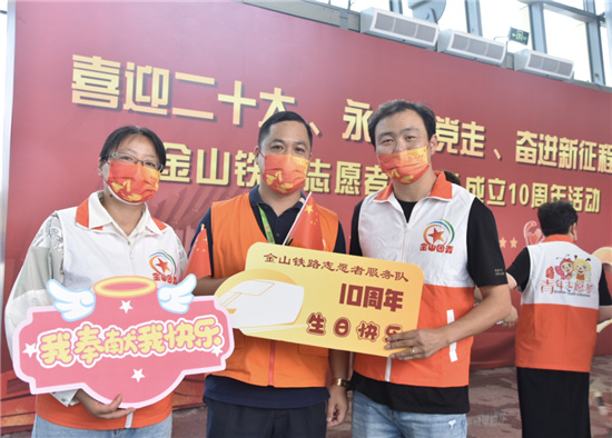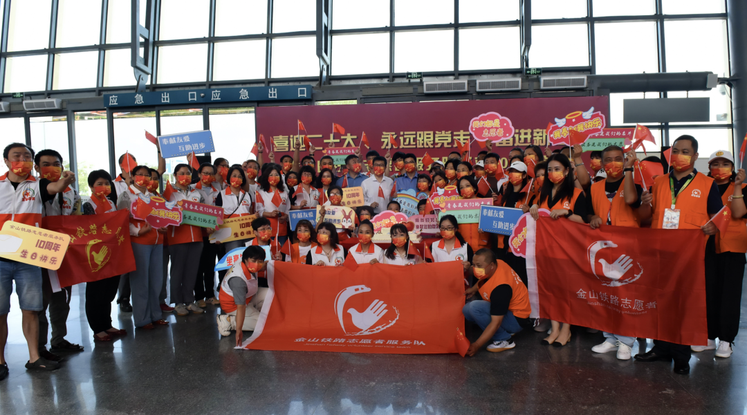 2012年9月28日,金山鐵路開通了,金山鐵路志愿者服務隊也應運而生。從新生到壯大、從摸索到創新、從單一到多元……十年來,金山鐵路志愿者服務隊從最早的30人,到如今的1693人,服務旅客人數達6500萬人次,志愿者服務14000余人次,服務時長超過4萬多小時。