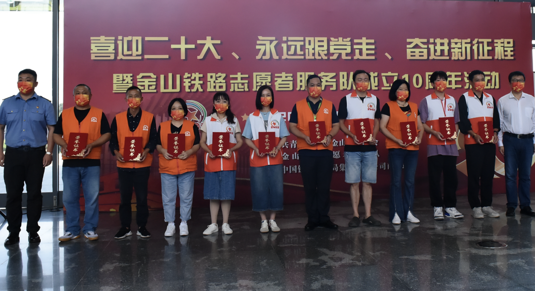 風雨十載,同心筑夢。昨天下午,“喜迎二十大 永遠跟黨走 奮進新征程”暨金山鐵路志愿者服務隊成立10周年活動在金山衛站大廳舉行?;顒蝇F場頒發了“金山鐵路志愿者服務隊10周年優秀志愿者”以及“10周年杰出志愿者”獎項。