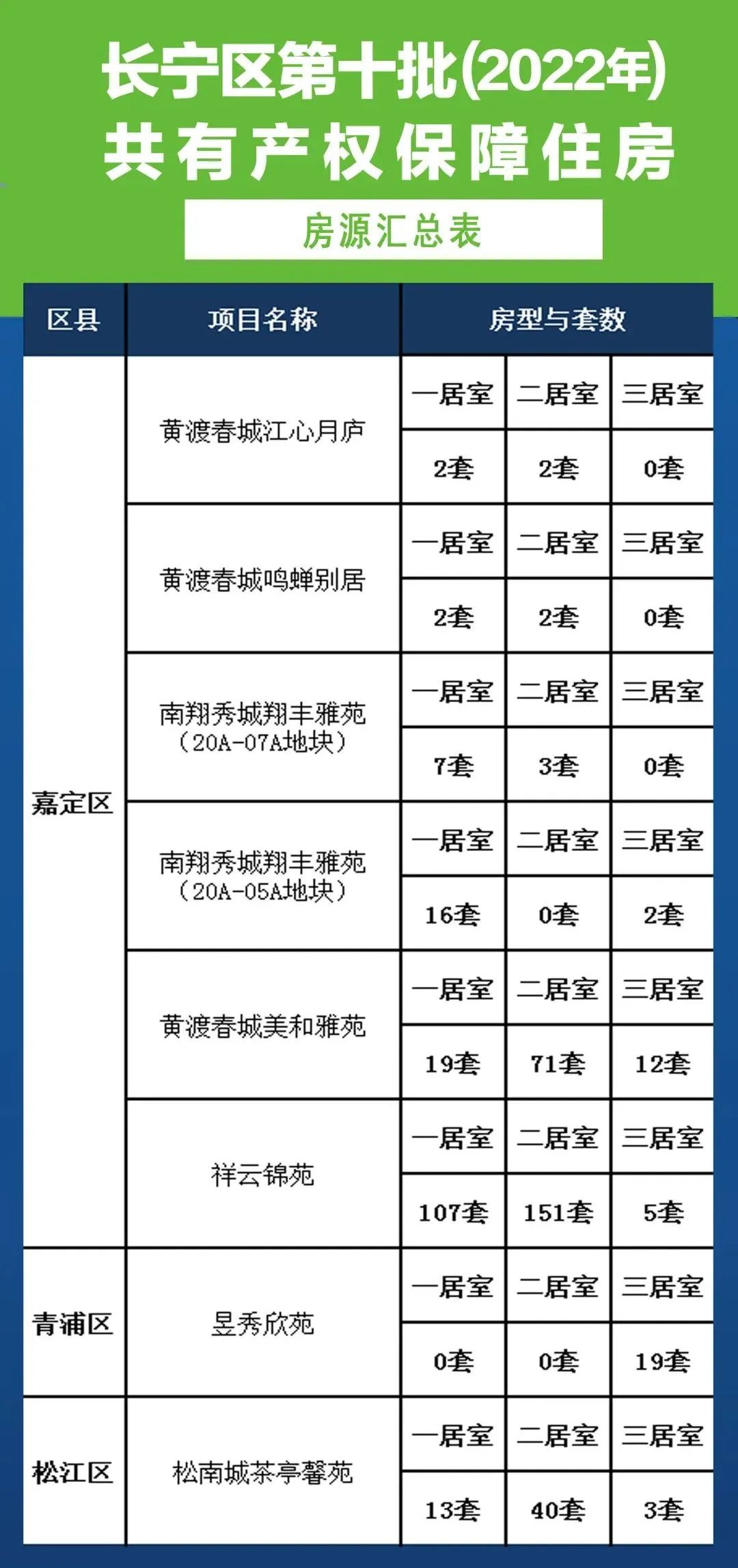長寧區第十批(2022年)共有產權保障住房房源分布在嘉定區、青浦區和松江區,共有8個基地??偺讛禐?76套,其中一居室166套、二居室269套、三居室41套。