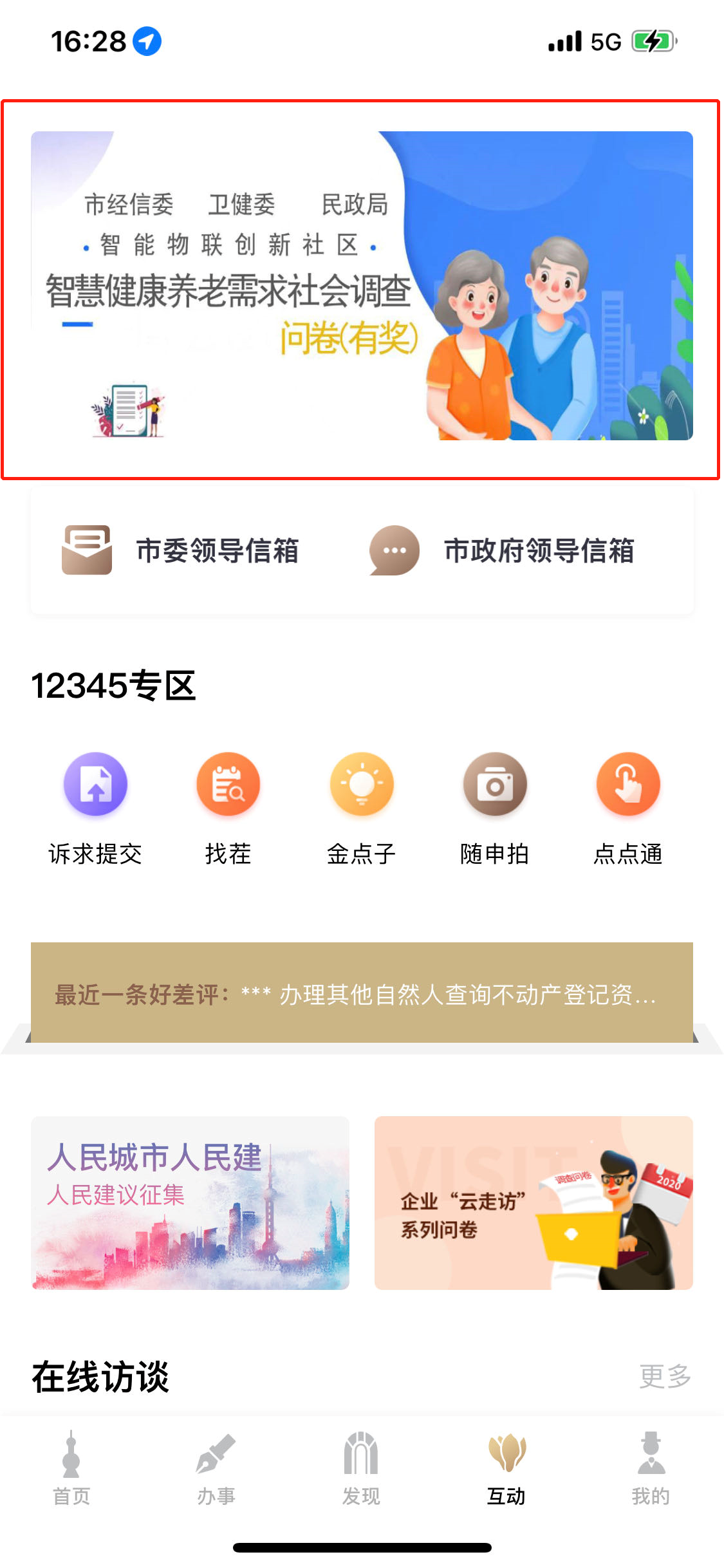 在隨申辦市民云APP、隨申辦微信小程序和隨申辦支付寶小程序的互動頻道圖中所示位置進入問卷,也可通過搜索【智慧健康養老社會調查】進入問卷。