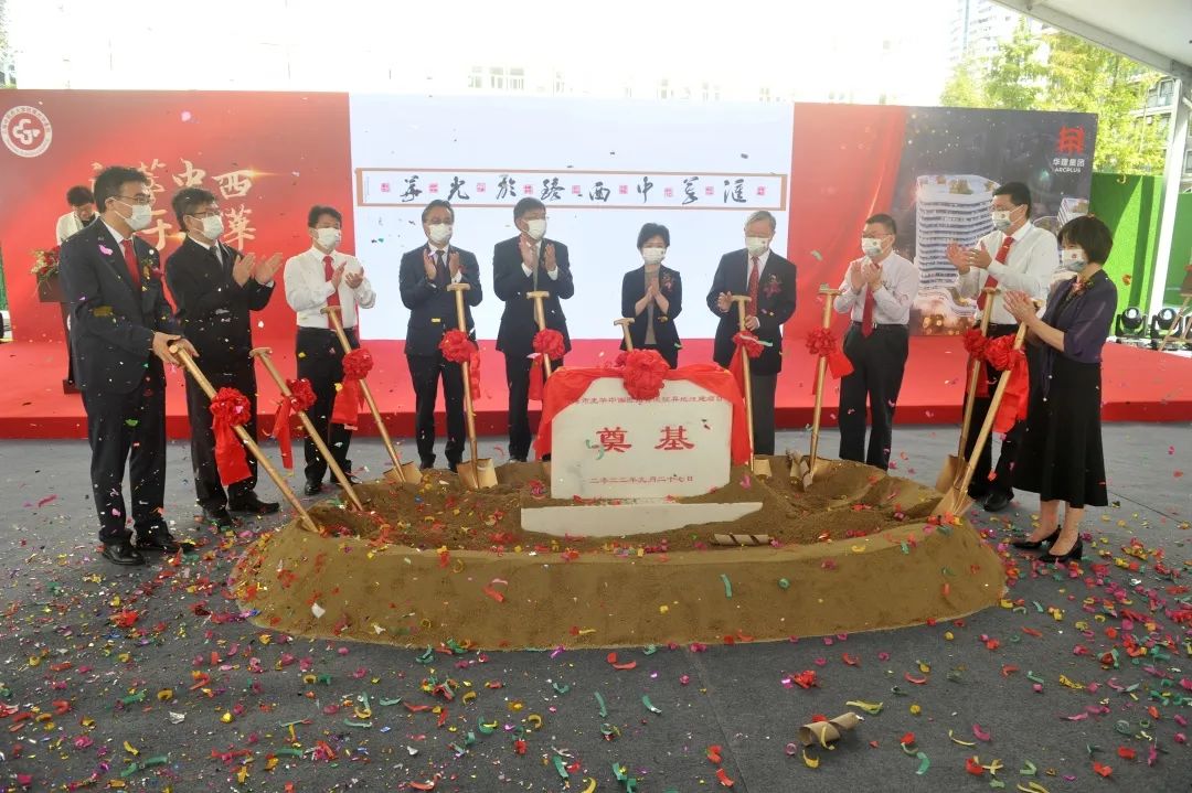 參會領導、嘉賓共同為光華醫院異地遷建項目開工奠基,不久的將來一所嶄新的、擁有8.8萬平方米建筑面積的現代化新光華醫院將屹立在延安西路上。