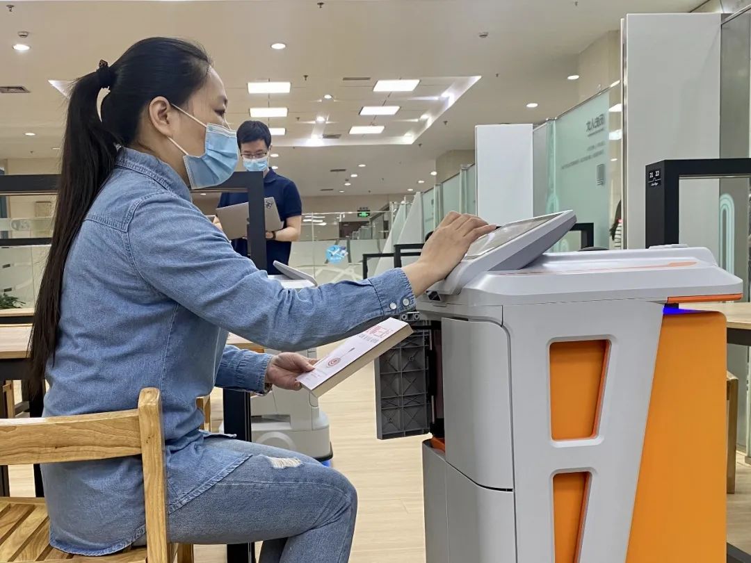 挑好書籍,讀者還可以通過“馨葉”或者“新頁書房”小程序,選擇“在館閱讀”或者“自助取書”等各類便捷服務。陳女士選擇“在館閱讀”并預約選座后,其預約信息就顯示在了書房入口處的電子屏上。進入書房的閱讀區域內短短幾分鐘,智慧閱讀機器人便來到陳女士預約的座位邊。她將手機收到的驗證碼輸入,機器人就打開“口袋”,送上了圖書。待閱讀完畢后,還書也可以由這臺小機器人完成。