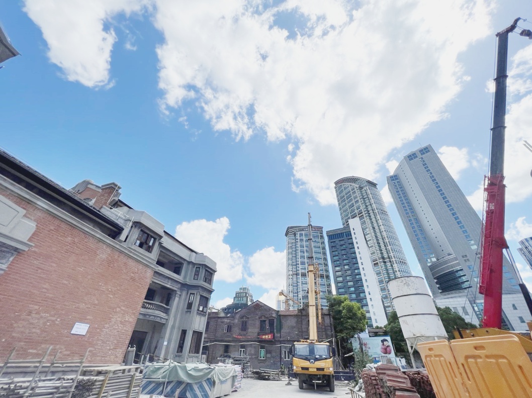 8月初,東妹走進正在修繕的張園,一棟棟空置的石庫門建筑,紅灰色的磚瓦,仿佛述說著老上海的風情。寬敞的弄堂里,蒸騰涼爽的霧氣彌漫在腳手架上。在疫情防控常態化下,張園的修繕有條不紊推進著。