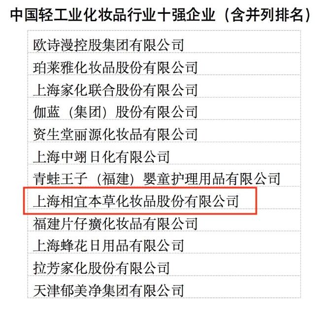 近日,中國輕工業聯合會發布了《中國輕工業行業十強企業評價結果公告(2021年度)》(中輕聯信統【2022】208號),寶山企業上海相宜本草化妝品股份有限公司入選2021年度中國輕工業化妝品行業十強企業。