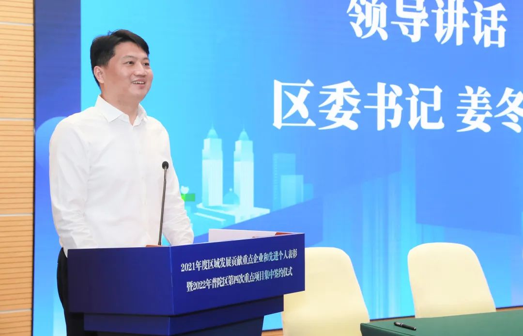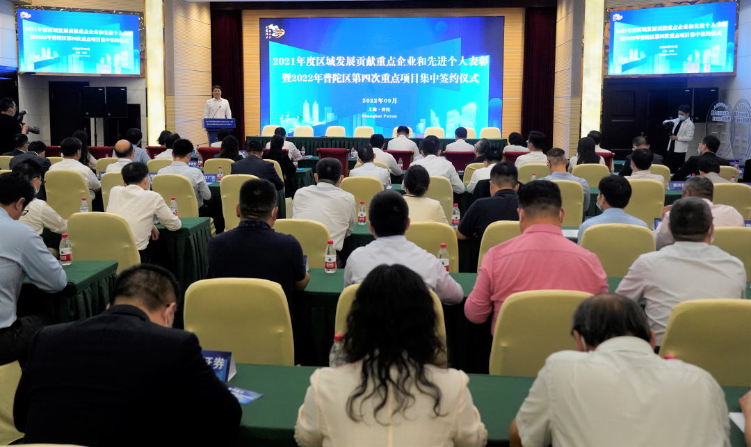 9月29日上午,2021年度普陀區區域發展貢獻重點企業和先進個人頒獎儀式暨2022年第四次重點項目集中簽約儀式在普陀區人民政府中心會場舉行。區委書記姜冬冬,區委副書記、區長肖文高,區人大常委會主任談上偉,區委副書記周艷等區四套班子領導出席活動。區委常委、副區長姚汝林主持。