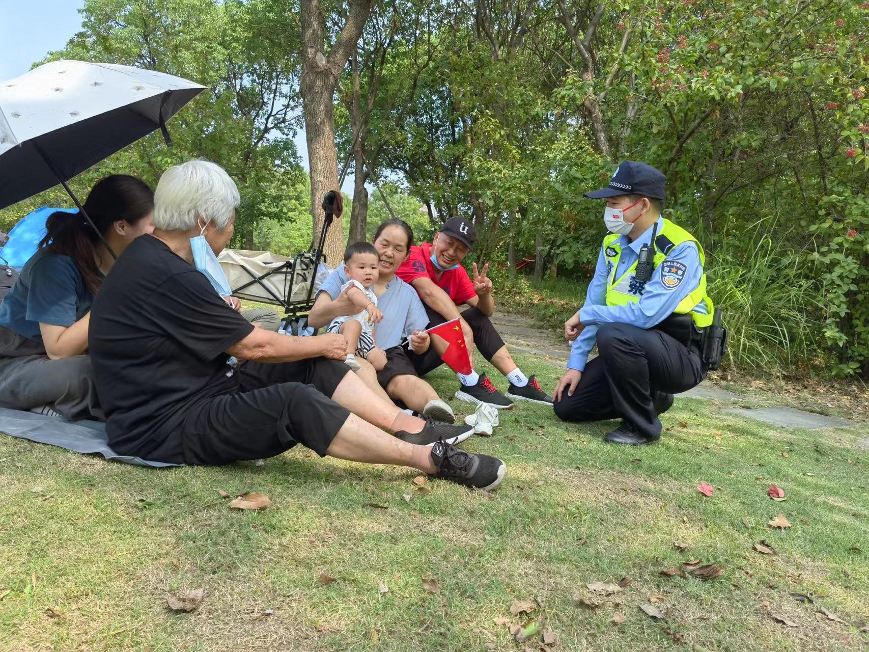 執勤民警除了在游樂區巡邏防范走失,在碼頭和小橋駐守提示防溺水外,在草坪區域的露營、野餐的游客也是民警關心的重要群體?!拔覀冎饕菑牟萜航鸷吐稜I防遺失兩個方面進行宣傳防范,既要維護景區的安全環境,也要避免游客的財產遭受損失?!泵窬炫瀛t如是說。在巡查中,民警還需要警察提醒游客合理保持天幕和帳篷間距,以防密集“扎營”和亂拉風繩造成的游客絆倒情況發生。(王文娟、馬凱、崔順成、陸澤昭)