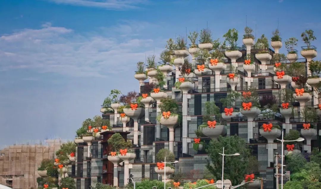 大洋晶典·天安千樹位于普陀區莫干山路600號。這座建筑的頂部由1000根錯落有序的長方形柱體組成,承載起1000多棵生長于中國山岳之間樹木的“懸浮森林”,讓人眼前一亮、過目難忘。