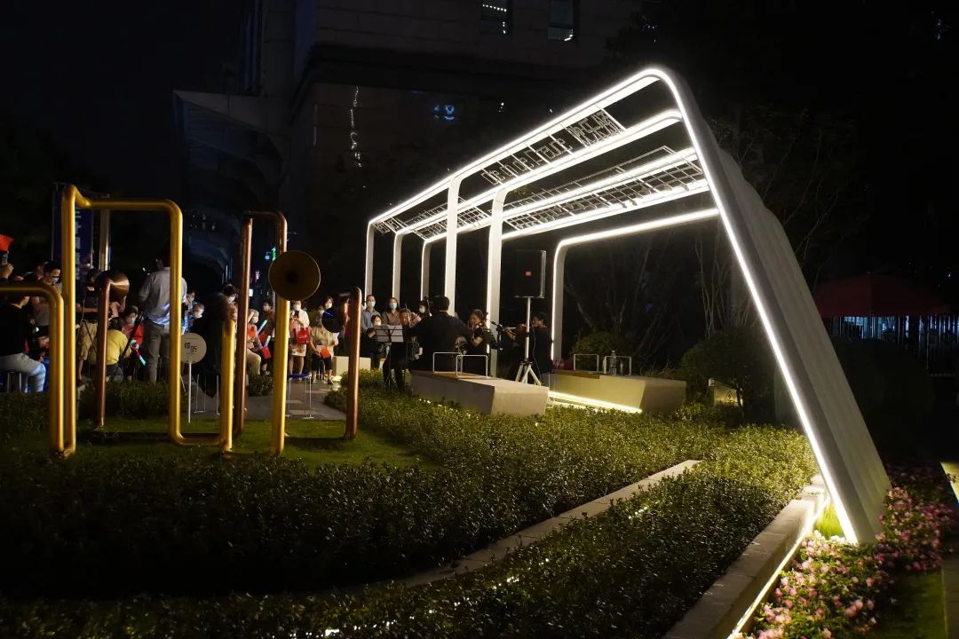 尤其到了夜晚,被光影點亮的廊架,仿佛長寧路川流不息的車流,又仿佛一支載滿了音符的五線譜,伴隨著地鐵的隆隆聲,奏響一曲循序漸進的行進曲,讓美妙的音樂傾瀉而出。