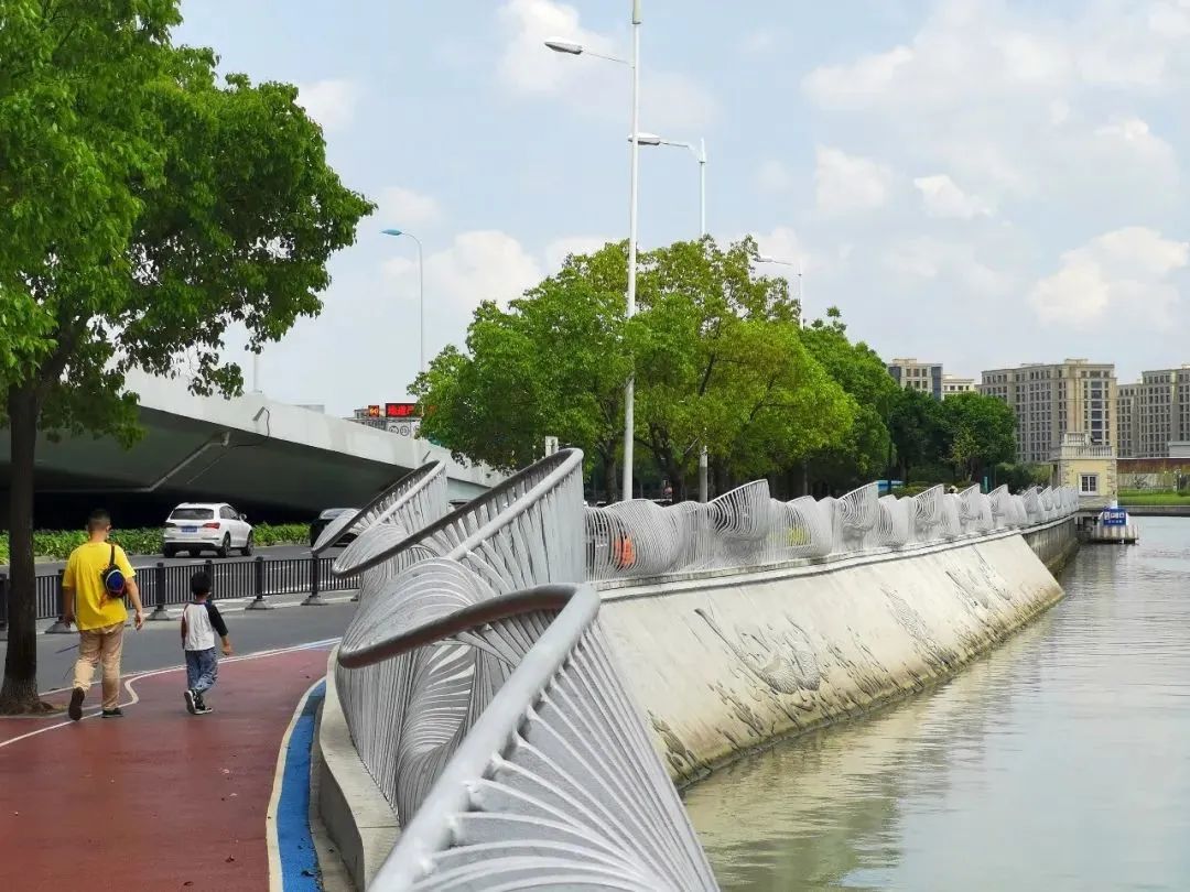 長寧蘇州河健身步道東起江蘇北路,西至外環線,其串聯著臨空音樂公園、滑板公園、風鈴綠地、中山公園和華政公共開放空間等10個公園綠地,形成了一條連接蘇州河長寧段沿岸風貌的“城市項鏈”。與此同時,還將公共空間貫通理念向腹地縱深拓展,西部連接6.25公里外環綠道,中部在蘇州河的支流新涇港打造3.7公里沿線慢行系統,逐步形成一張慢行生態網。