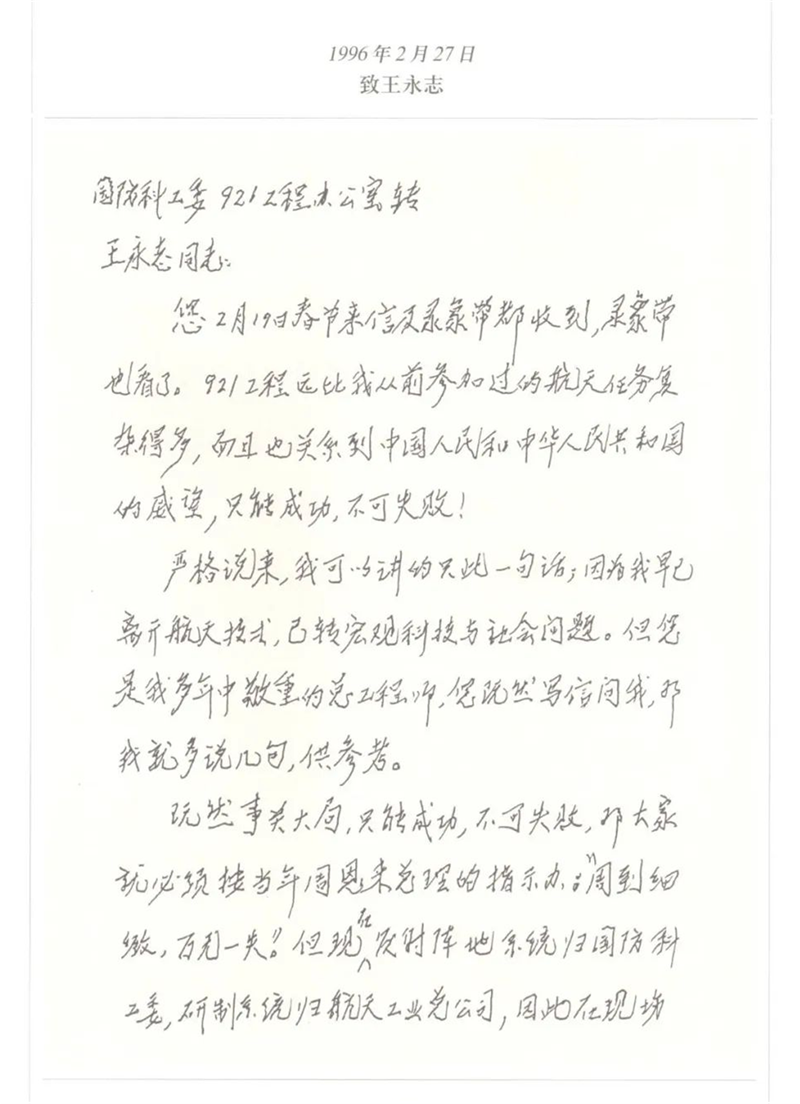 2022年9月21日,在人民科學家錢學森歸國67周年之際,上海交通大學錢學森圖書館推出了中國載人航天三十周年科普展。在線上展覽中,錢學森的一封手寫信尤為引人注目,信里提到“921工程遠比我之前參加過的航天任務復雜得多,而且也關系到中國人民和中華人民共和國的威望,只能成功,不可失敗?!?/p>
