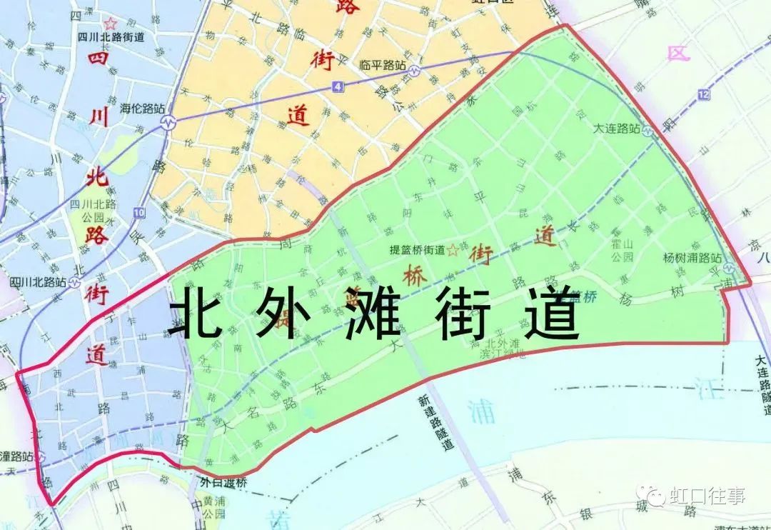 北外灘街道轄區示意圖,紅框內紫色部分為原四川北路街道轄區,綠色部分為原提籃橋街道轄區