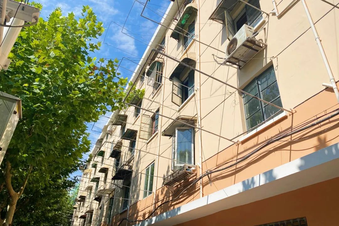 直到吹來了舊住房成套改造項目的“東風”,“老房新生”的愿景在這里落地生花。五村主要采用“貼擴建”的方式進行成套改造,即敲掉位于居民樓北面的合用廚衛,擴建出嶄新獨立的廚房與衛生間,以改善居民的生活環境。
