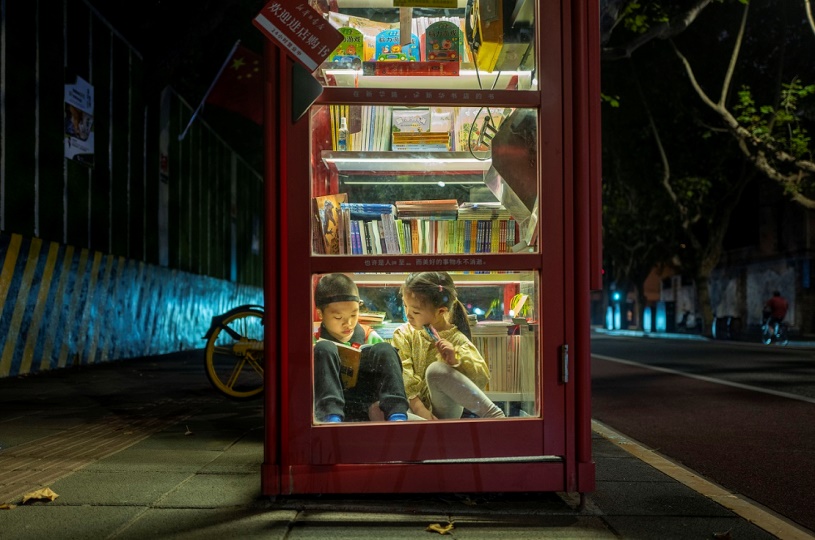 9月30日晚,8歲的黃中曦與6歲的妹妹黃安妤偎依在電話亭中。孩子們家在附近,放學后特意趕來書店看書。燈光照亮孩子們手中的書,也溫暖著孩子們小小的身影。