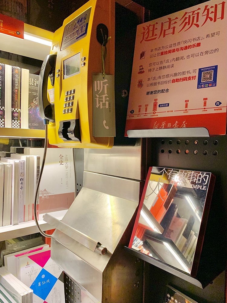 電話機旁的“逛店須知”寫著:本書店為公益性質的“快閃書店”,希望可以讓您重拾閱讀與溝通的樂趣;你可以在“店”內翻閱,也可以在旁邊的椅子上靜靜閱讀;本“店”有您感興趣的圖書,可以根據書目標價自助掃碼支付——旁邊是一個小小的二維碼。