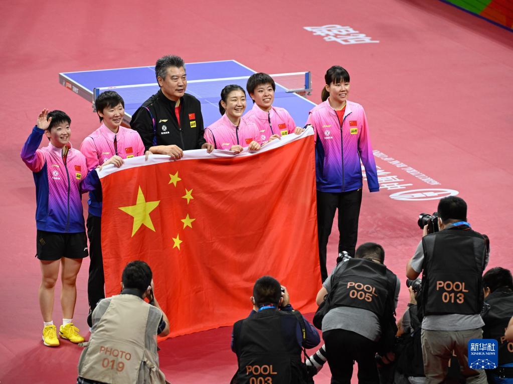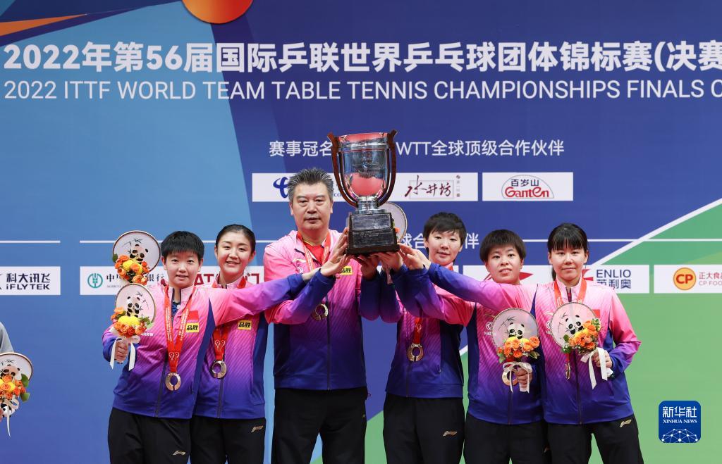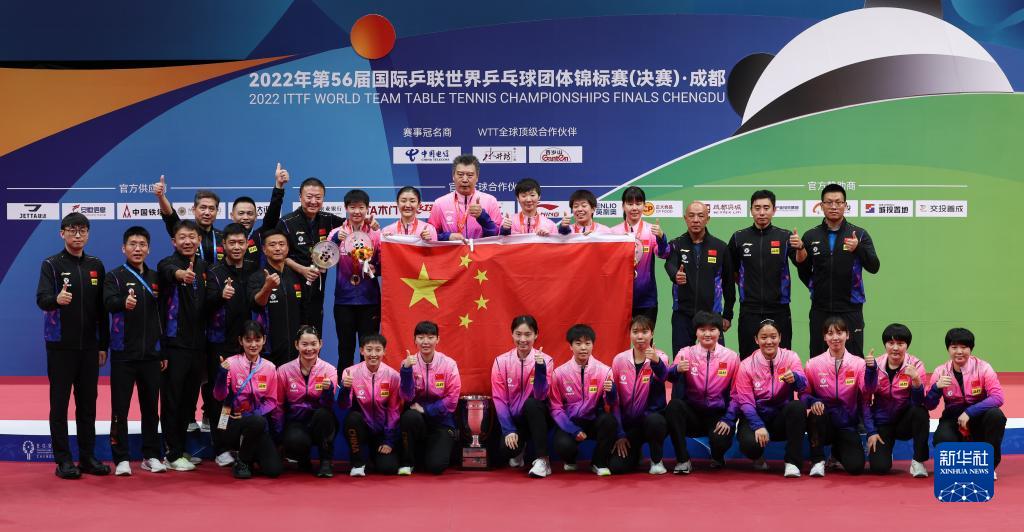 新華社成都10月8日電(記者陳地)8日晚,備受關注的2022年第56屆世界乒乓球團體錦標賽女團決賽上演,中國隊三名隊員陳夢、王曼昱、孫穎莎發揮出色,3:0完勝日本隊,幫助中國隊以八戰全勝的驕人戰績奪冠,并實現世乒賽五連冠。
