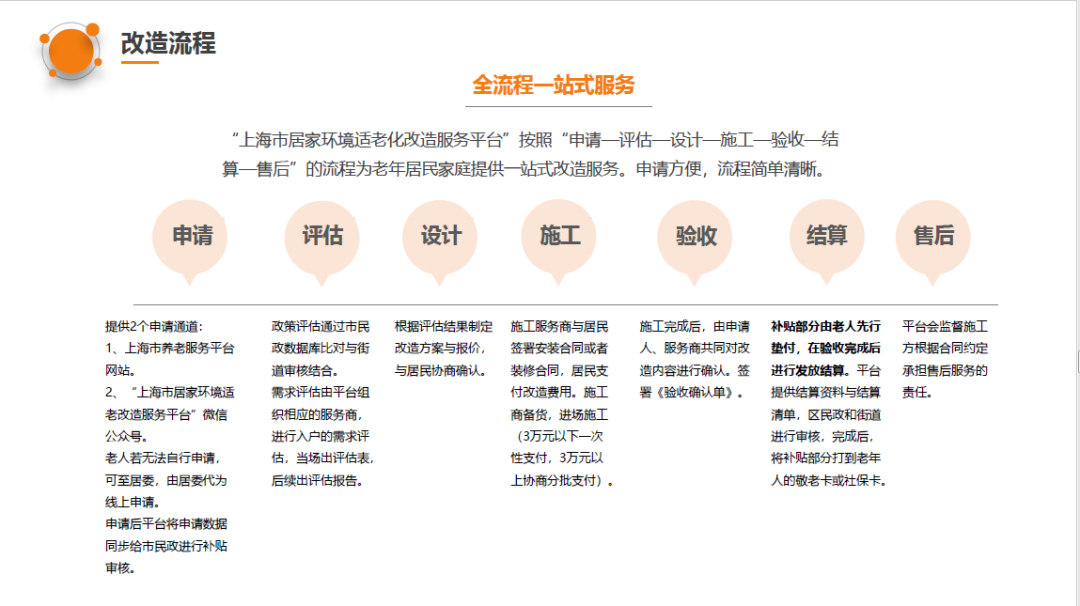 直到2020年,適老化改造才啟動了市場化運作之路。按照玄關、衛生間、廚房、客廳、臥室、陽臺、過道七大生活場景進行分類,多達60余項產品與服務,老年人可以根據自己的需求進行組合搭配,政府給予一定比例的改造補貼。