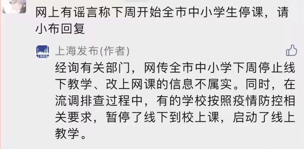 上海發布:“全市中小學下周停止線下教學、改上網課”信息不屬實