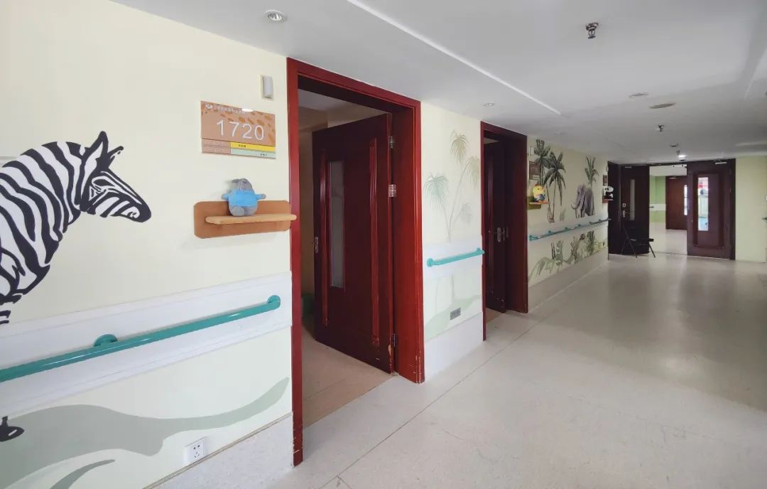 7樓的照護專區墻面裝飾以綠植、動物的大自然風光,讓老人在室內園藝環境中得以舒緩情緒、釋放壓力,每間房的門口,都有一個代表性的小動物玩偶?!坝姓J知障礙的老人,首先表現就是記憶力下降,時常記不住自己的房間號。但每天進出都能看到的‘小動物’,他們往往能夠記住?!蔽鹘紖f和頤養院的工作人員表示。