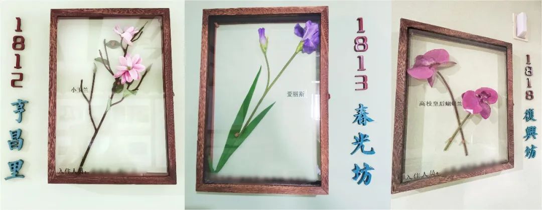 和7層不同的事,8層的房間門口放置的是不同的花卉標本,增加房間的辨識度。每間房還有自己的名字,如春光坊、亨昌里、愚園里……這些長寧區部分地方的舊名稱,老人們都耳熟能詳。