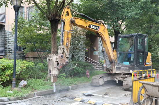 在金山區楓涇鎮楓景家園小區內,一片忙碌的施工場景。伴隨著鉆孔機開工的“隆隆聲”,施工人員對照著圖紙,挖掘、測量標高,做好排管前的每個步驟。在施工圍欄之外,居民的生活一切如常。