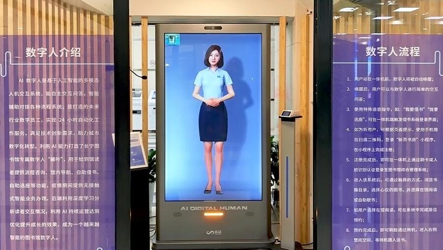 走進長寧區圖書館一樓大廳,讀者首先會被一個名叫“馨葉”的數字人引導員吸引。只需向她出示隨申碼或讀者證,她就會根據大數據推算出讀者的借書喜好,進行館內熱門圖書、個性化書籍推薦,輔助讀者完成圖書借閱、座位預約等操作。