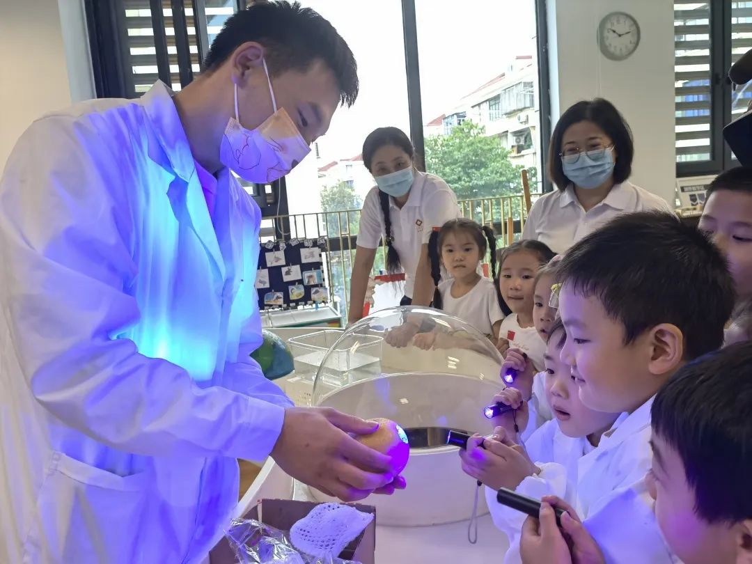 疾控工作專業性強,為了讓小朋友們更好地理解細菌的概念,工作人員特地設計了一個紫光燈小實驗:通過紫光燈照射生梨表面,讓小朋友們看到梨子表皮上呈現的一個個圓形斑塊,由此告訴他們“細菌”的概念,并教育大家吃水果前一定要洗一洗。中午午飯時間,小朋友們還在大廚的帶領下來到食堂,了解食品安全知識,學習怎么看食品保質期。