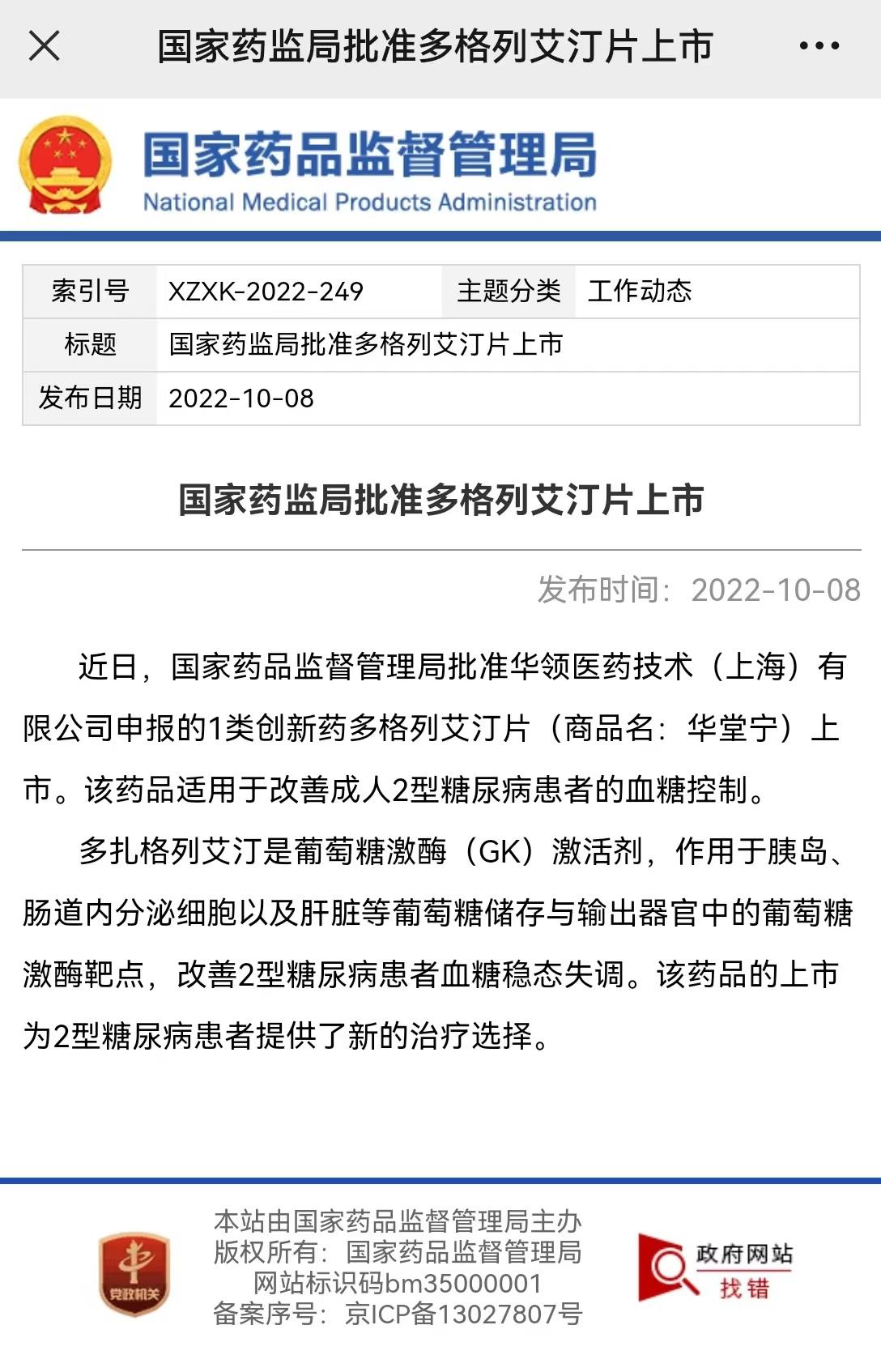 國家藥品監督管理局10月8日晚發布消息:正式批準1類創新藥多格列艾汀片上市。該藥品適用于單獨用藥或與二甲雙胍聯合用藥,改善2型糖尿病患者的血糖控制。大江東工作室注意到,上海藥監局稱:這款本市自主研發的1類全球創新藥由華領醫藥技術(上海)有限公司研發并持有、上海迪賽諾生物醫藥有限公司受托生產,是張江研發、上海生產的典型代表,也是上海試點藥品上市許可持有人制度(MAH)、推動創新研發成果快速上市的成功案例。
