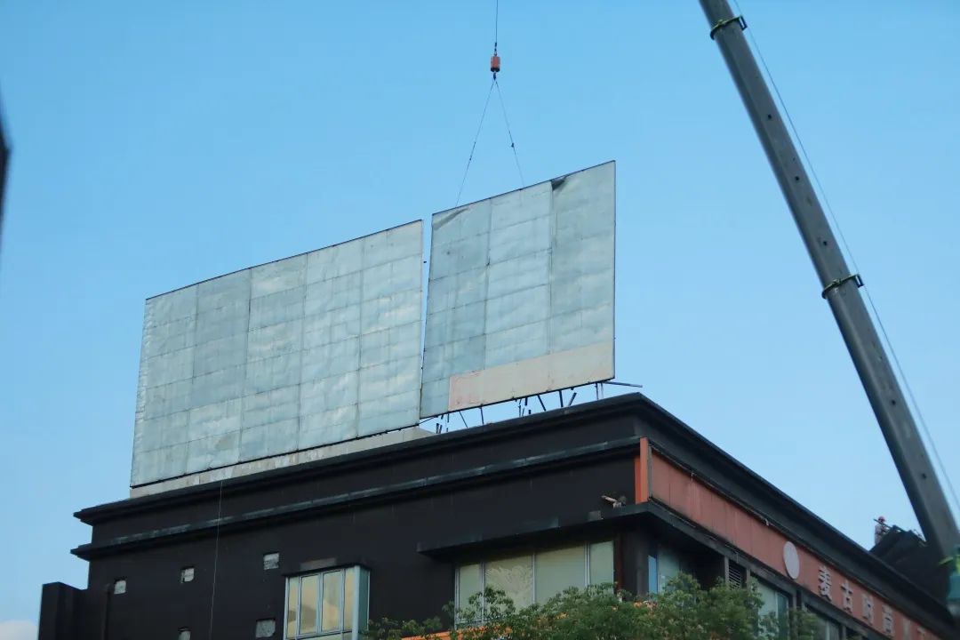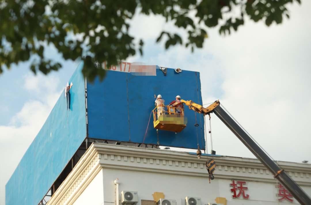 在金山區蒙山北路龍翔路路口,一臺50噸的大型吊機正緩緩將歐富商業廣場樓頂的違規戶外廣告設施切割后慢慢吊下,這是山陽鎮認真貫徹落實城市精細化管理要求,推進“美麗灣區”建設,切實保障城市運行安全的有力舉措。
