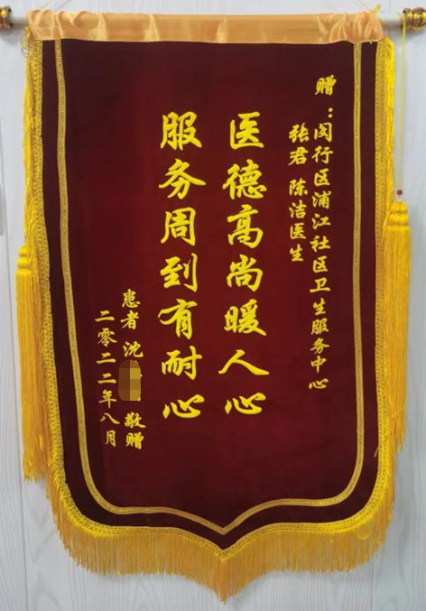 “太感謝陳潔醫生、張君醫生了,要不是她們及早發現,后果不堪設想啊?!弊罱?,住在浦江鎮的沈阿姨拿著錦旗,專程送到浦江社區衛生服務中心B超室,特別感謝兩位醫生專業又負責的態度。